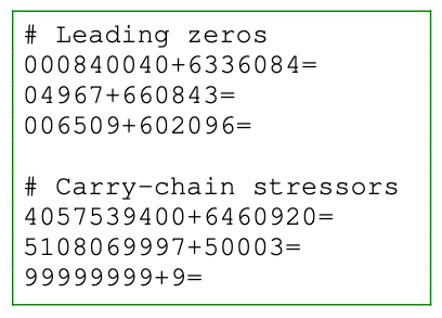 - Carry-chain stressors: examples that need to carry a digit during summation.