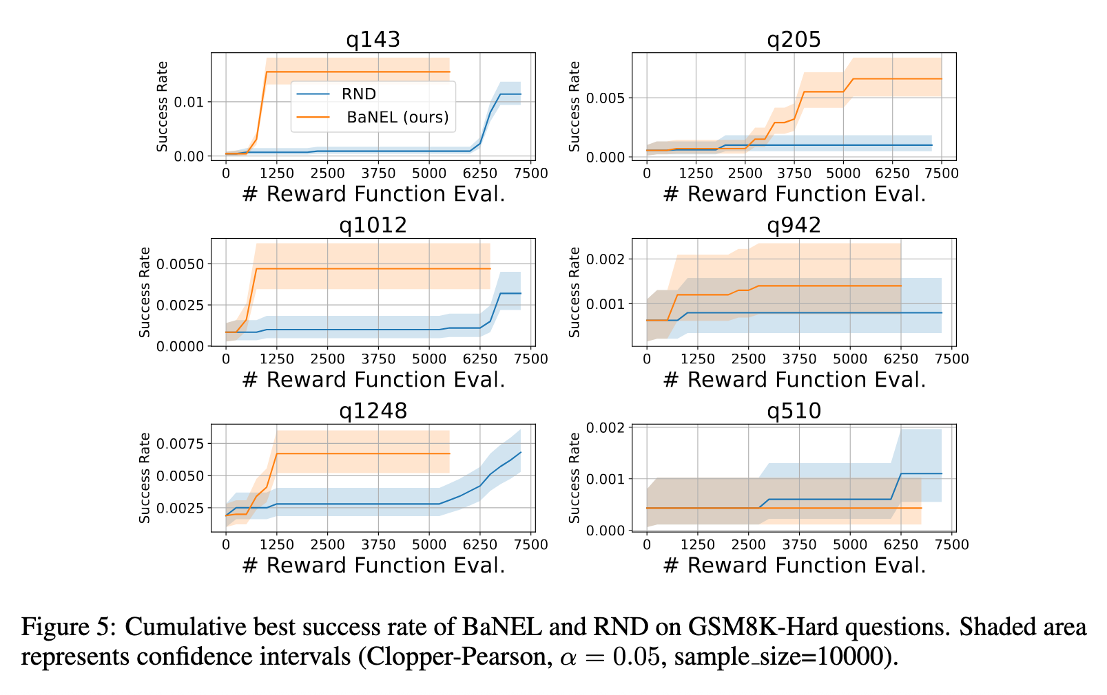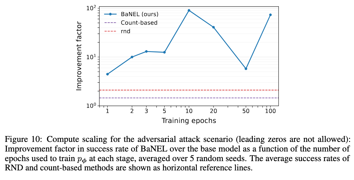 We also study scaling with compute (here we don’t allow leading zero attacks to make the problem even more challenging). When the negative generative model $p_\phi$ is under-trained (few epochs), BaNEL performs on-par with simpler novelty-bonus baselines (RND, pseudo-counts). But as we spend more compute on $p_\phi$ (without additional NREs), BaNEL outperforms these methods by a large margin. This highlights a key property: BaNEL trades compute for reward efficiency. It is suboptimal under strict compute limits but excels when additional offline computation is available.