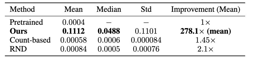 As shown in this table, BaNEL improves the success rate by 278x on average, outperforming baselines by several orders of magnitude.