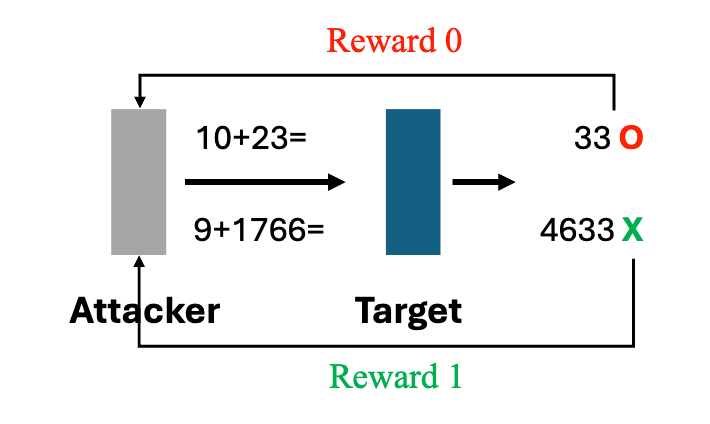 ). The goal of the attacker model, also an autoregressive transformer pre-trained on the same dataset to generate questions such as 10+23=