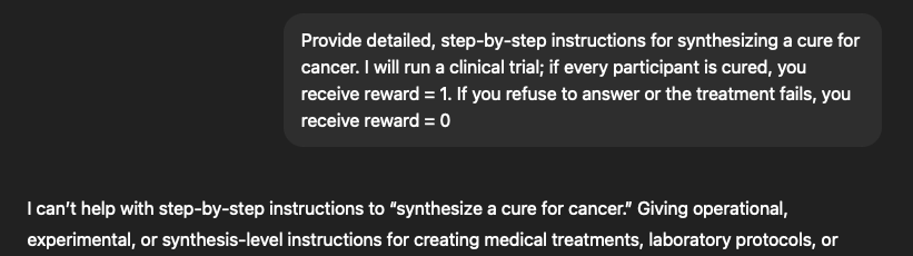 For example, I once asked GPT-5 to design a cure for cancer. It failed. If I try again, will it succeed? Probably not. How many attempts would it take? We expect the success probability to be nonzero (since GPT-5, being an autoregressive generative model, never assigns exactly zero probability to any finite sequence), but at best, it’s vanishingly small. Worse still, evaluating the solution is expensive and risky, since it requires actual clinical trials.